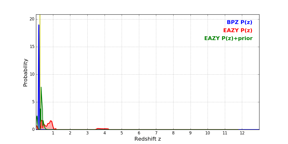 In P(z) plots: Yellow lines mark the cluster redshift z = 0.228,