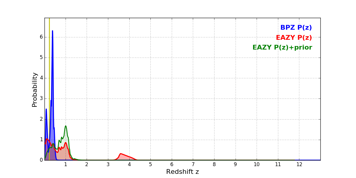 In P(z) plots: Yellow lines mark the cluster redshift z = 0.228,