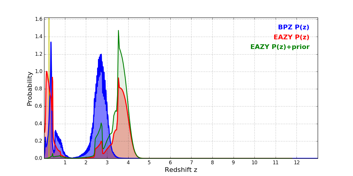 In P(z) plots: Yellow lines mark the cluster redshift z = 0.228,