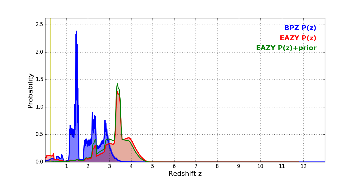 In P(z) plots: Yellow lines mark the cluster redshift z = 0.228,
