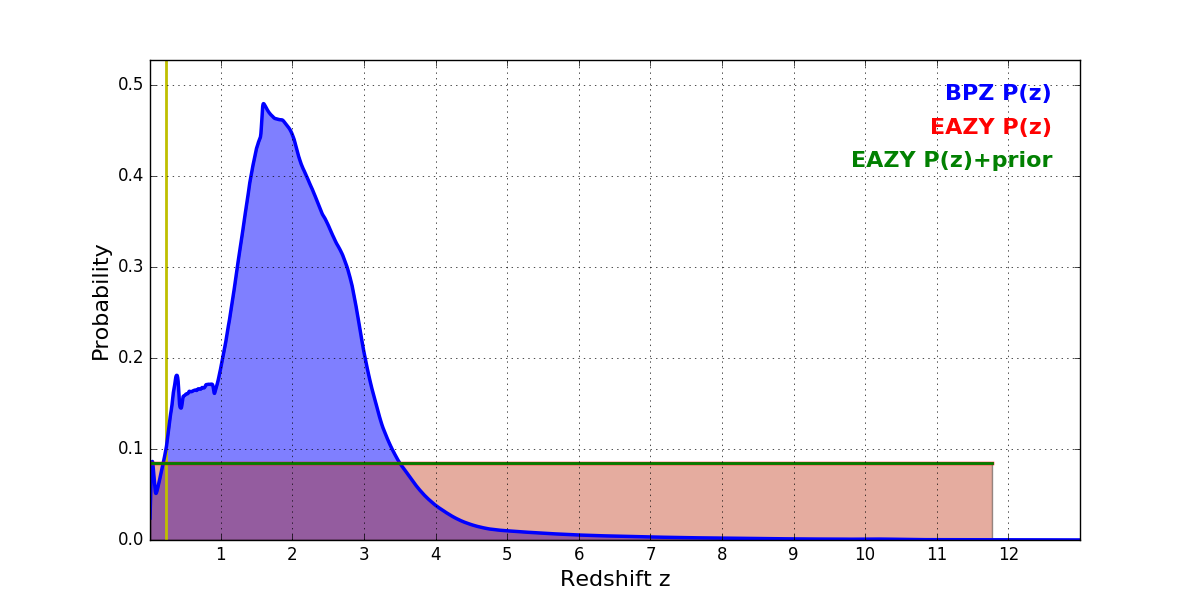 In P(z) plots: Yellow lines mark the cluster redshift z = 0.228,