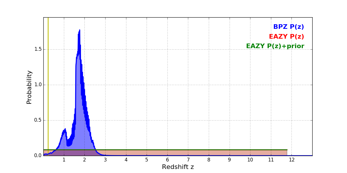 In P(z) plots: Yellow lines mark the cluster redshift z = 0.228,