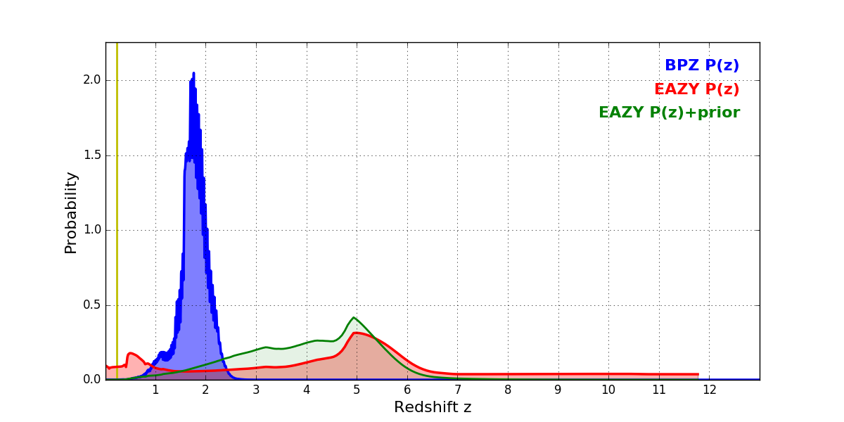 In P(z) plots: Yellow lines mark the cluster redshift z = 0.228,