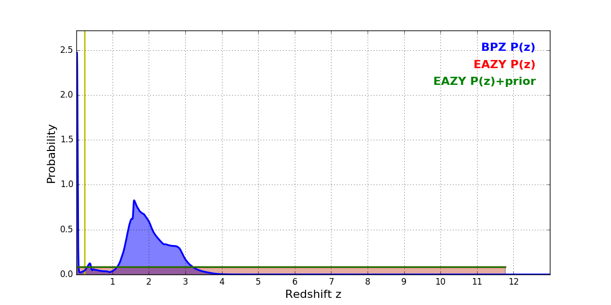 In P(z) plots: Yellow lines mark the cluster redshift z = 0.228,