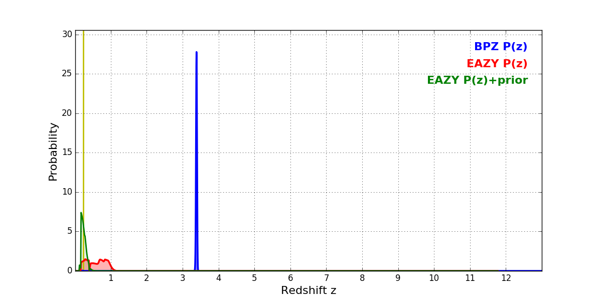 In P(z) plots: Yellow lines mark the cluster redshift z = 0.228,