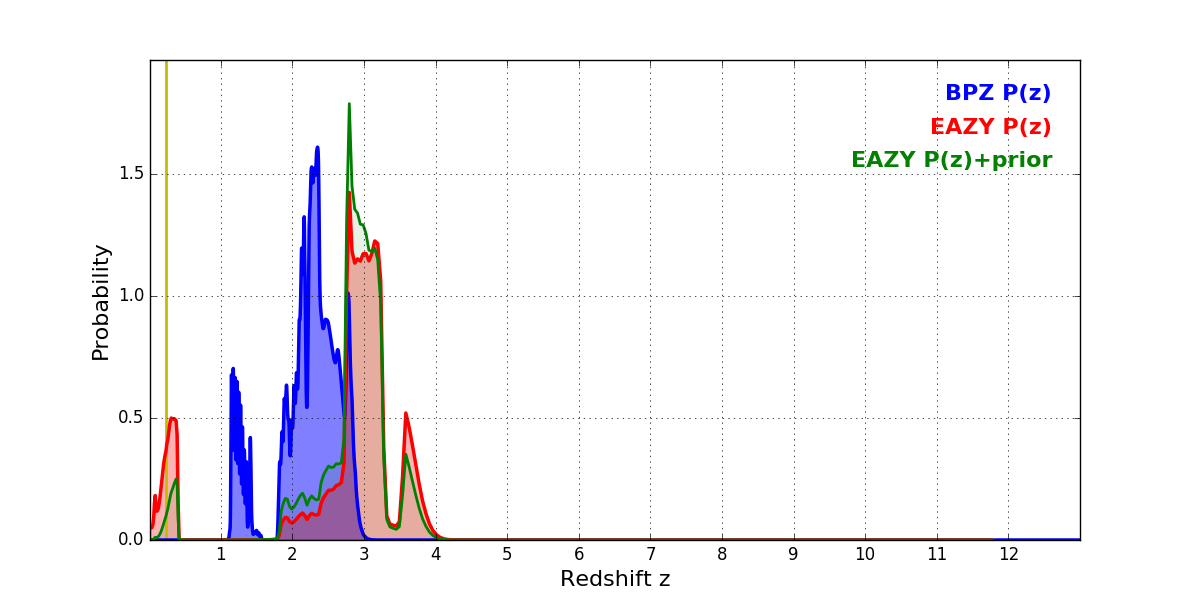 In P(z) plots: Yellow lines mark the cluster redshift z = 0.228,