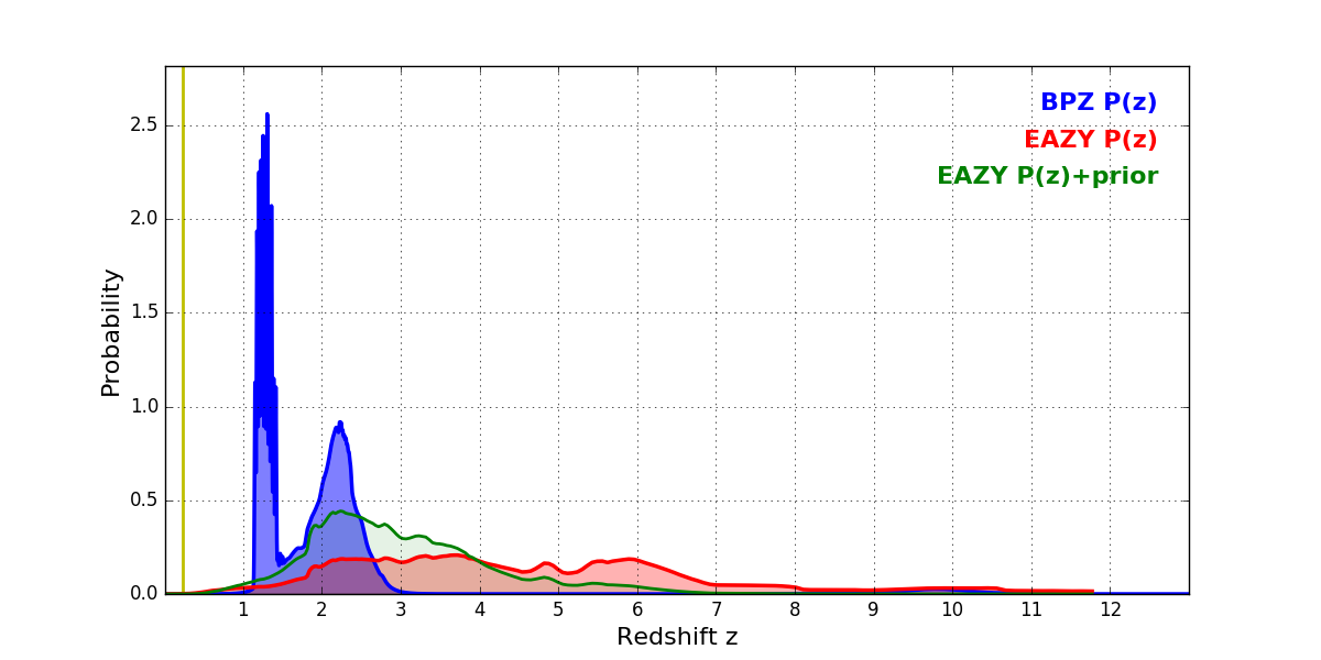 In P(z) plots: Yellow lines mark the cluster redshift z = 0.228,