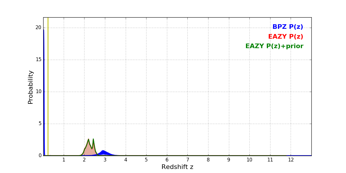 In P(z) plots: Yellow lines mark the cluster redshift z = 0.228,