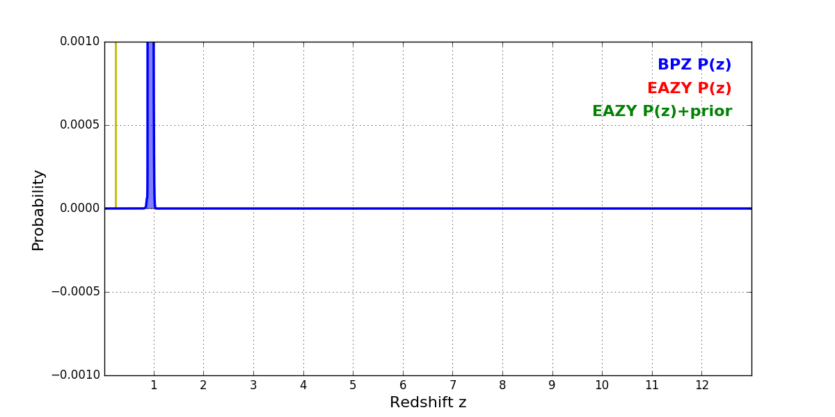 In P(z) plots: Yellow lines mark the cluster redshift z = 0.228,