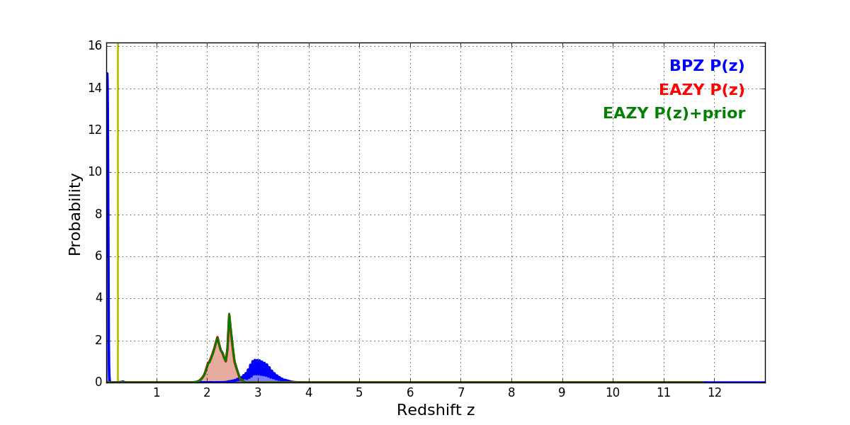 In P(z) plots: Yellow lines mark the cluster redshift z = 0.228,