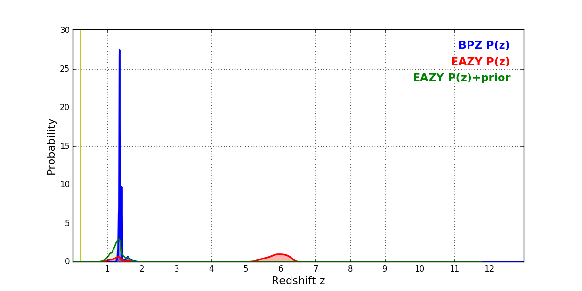 In P(z) plots: Yellow lines mark the cluster redshift z = 0.228,