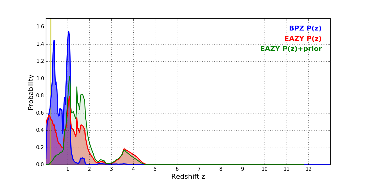 In P(z) plots: Yellow lines mark the cluster redshift z = 0.228,