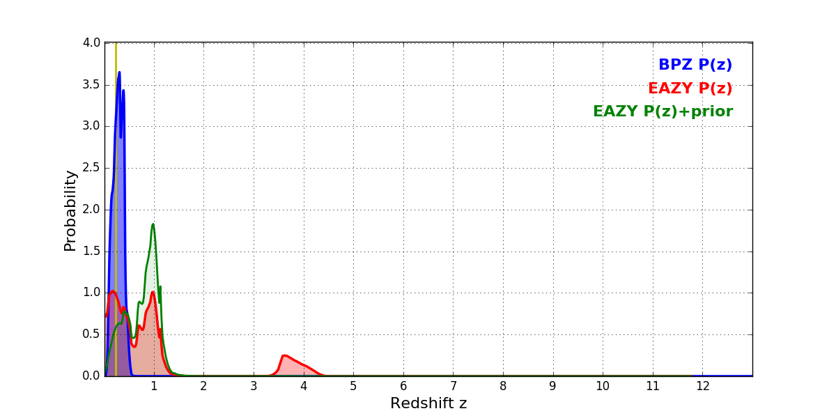 In P(z) plots: Yellow lines mark the cluster redshift z = 0.228,