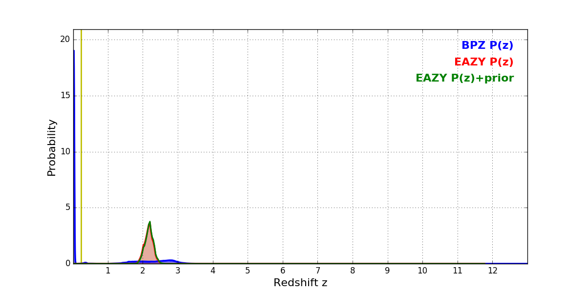 In P(z) plots: Yellow lines mark the cluster redshift z = 0.228,
