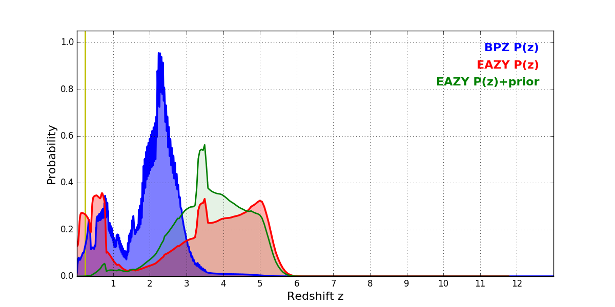 In P(z) plots: Yellow lines mark the cluster redshift z = 0.228,