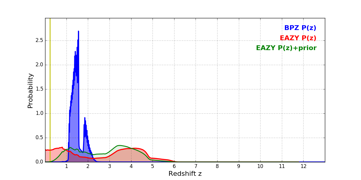 In P(z) plots: Yellow lines mark the cluster redshift z = 0.228,
