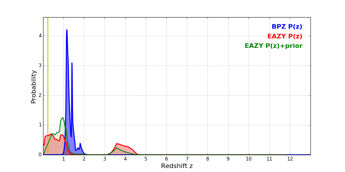In P(z) plots: Yellow lines mark the cluster redshift z = 0.228,