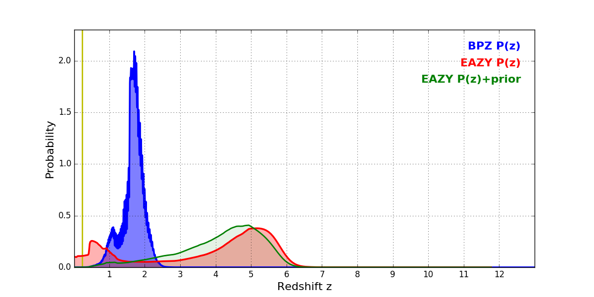 In P(z) plots: Yellow lines mark the cluster redshift z = 0.228,
