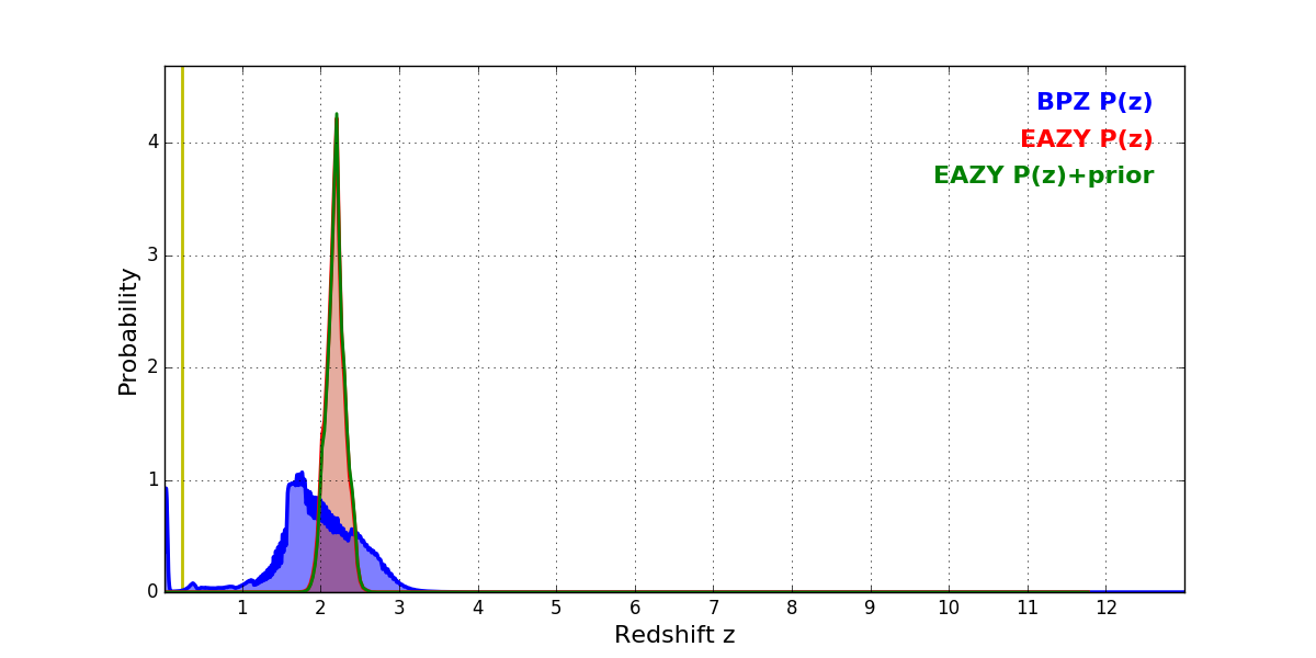 In P(z) plots: Yellow lines mark the cluster redshift z = 0.228,