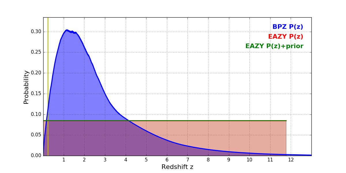 In P(z) plots: Yellow lines mark the cluster redshift z = 0.228,
