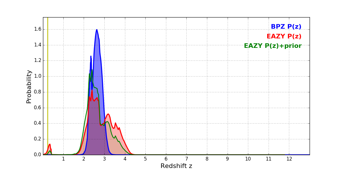 In P(z) plots: Yellow lines mark the cluster redshift z = 0.228,
