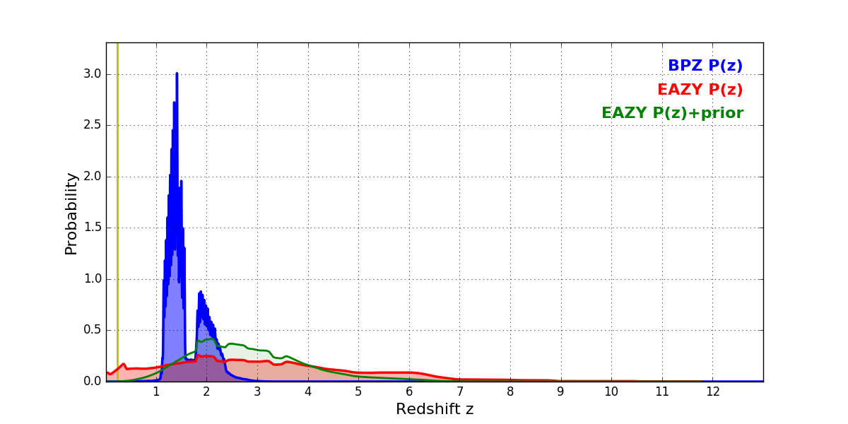 In P(z) plots: Yellow lines mark the cluster redshift z = 0.228,