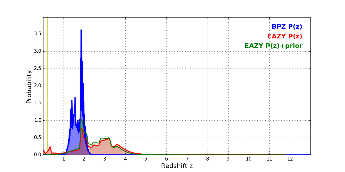 In P(z) plots: Yellow lines mark the cluster redshift z = 0.228,