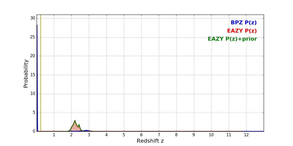 In P(z) plots: Yellow lines mark the cluster redshift z = 0.228,