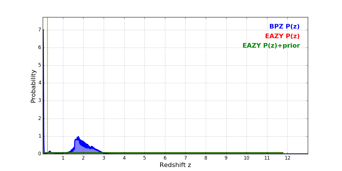 In P(z) plots: Yellow lines mark the cluster redshift z = 0.228,