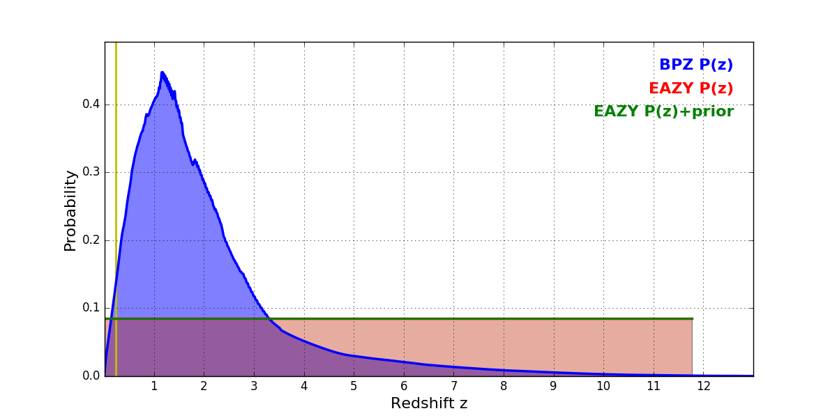 In P(z) plots: Yellow lines mark the cluster redshift z = 0.228,