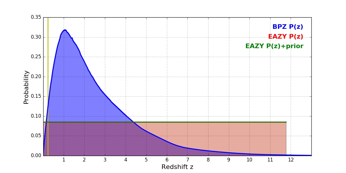 In P(z) plots: Yellow lines mark the cluster redshift z = 0.228,