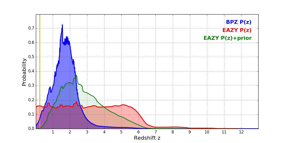 In P(z) plots: Yellow lines mark the cluster redshift z = 0.228,