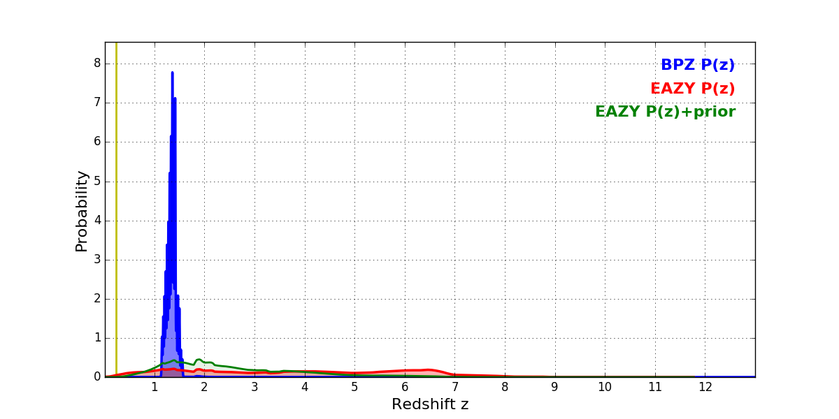In P(z) plots: Yellow lines mark the cluster redshift z = 0.228,