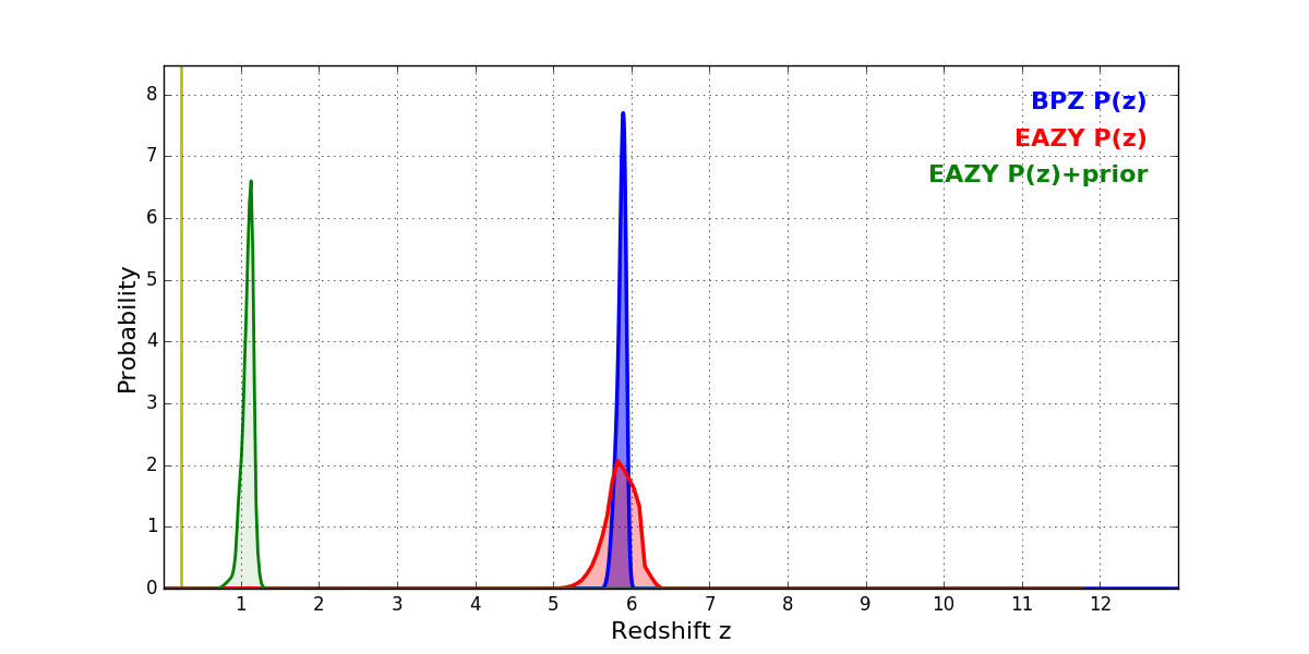 In P(z) plots: Yellow lines mark the cluster redshift z = 0.228,