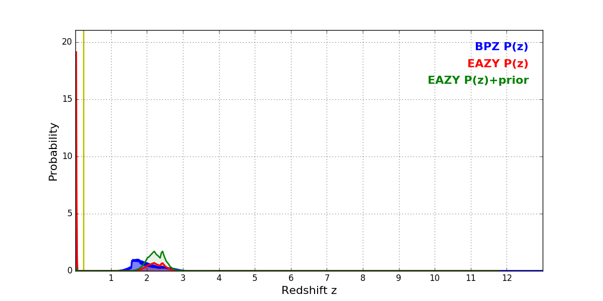 In P(z) plots: Yellow lines mark the cluster redshift z = 0.228,
