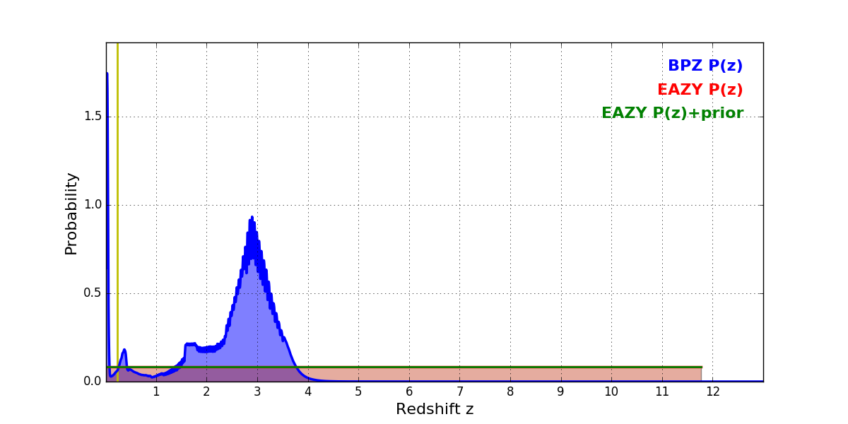 In P(z) plots: Yellow lines mark the cluster redshift z = 0.228,