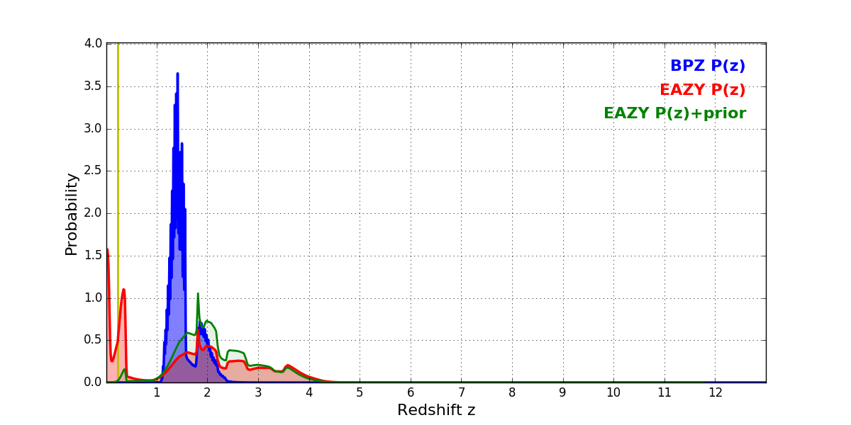 In P(z) plots: Yellow lines mark the cluster redshift z = 0.228,
