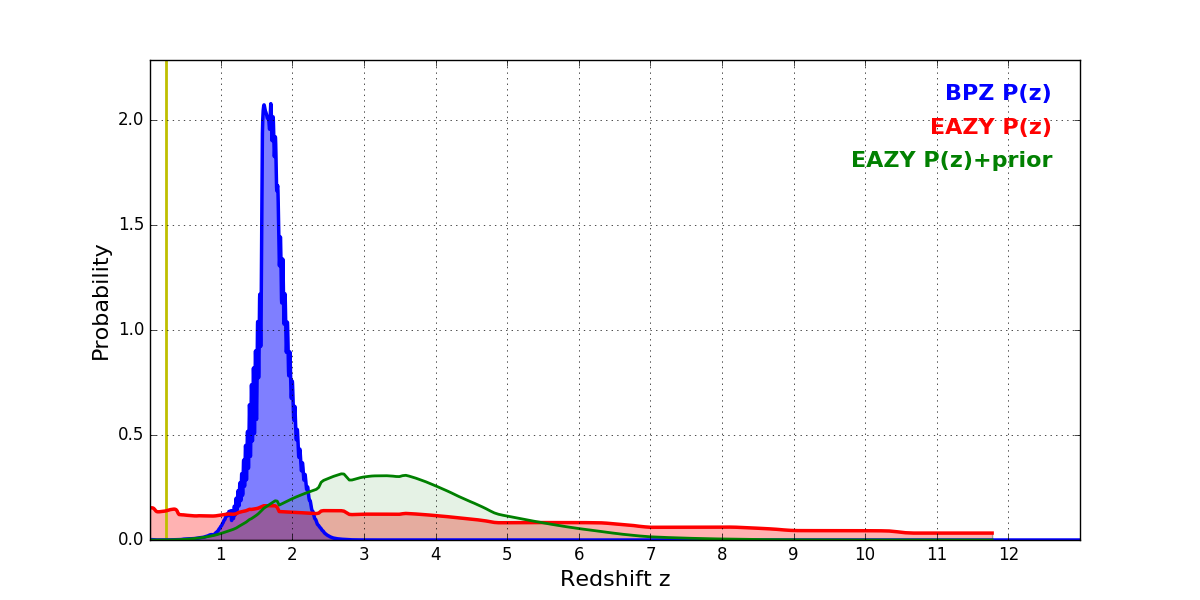 In P(z) plots: Yellow lines mark the cluster redshift z = 0.228,