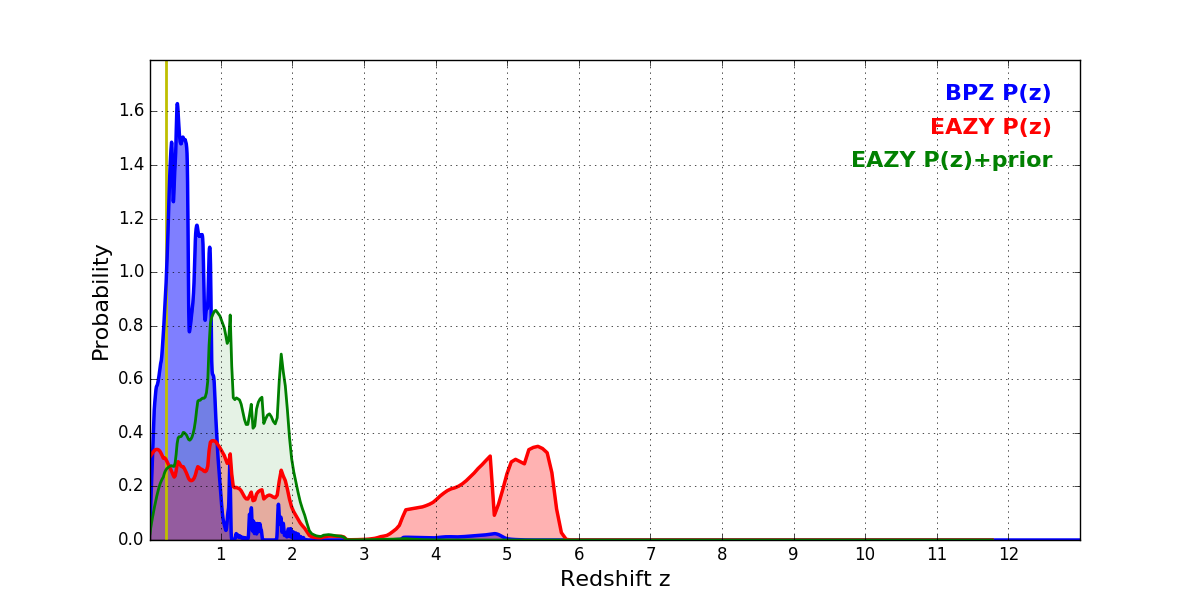 In P(z) plots: Yellow lines mark the cluster redshift z = 0.228,