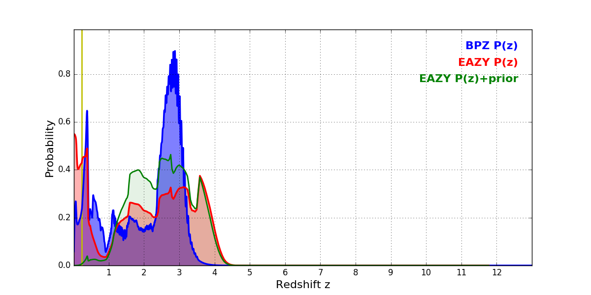 In P(z) plots: Yellow lines mark the cluster redshift z = 0.228,
