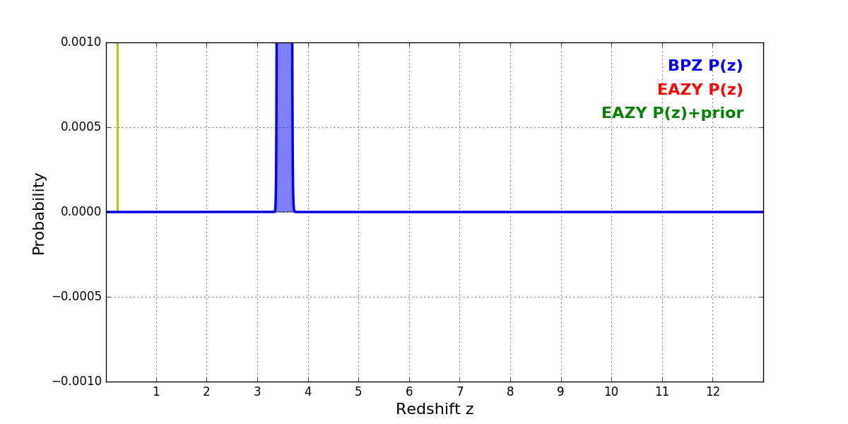 In P(z) plots: Yellow lines mark the cluster redshift z = 0.228,