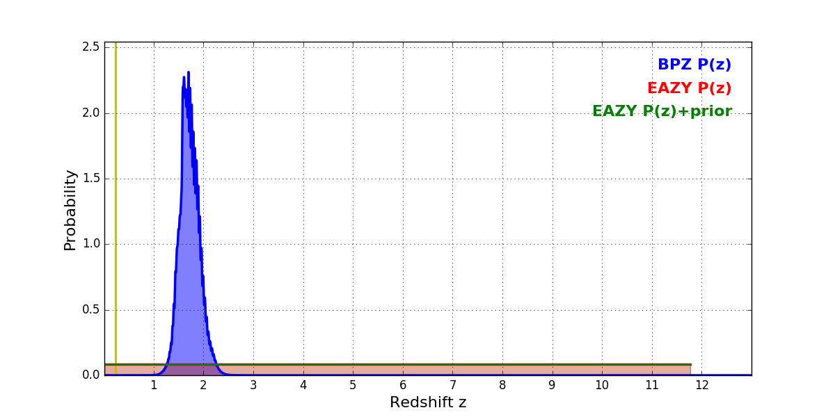In P(z) plots: Yellow lines mark the cluster redshift z = 0.228,
