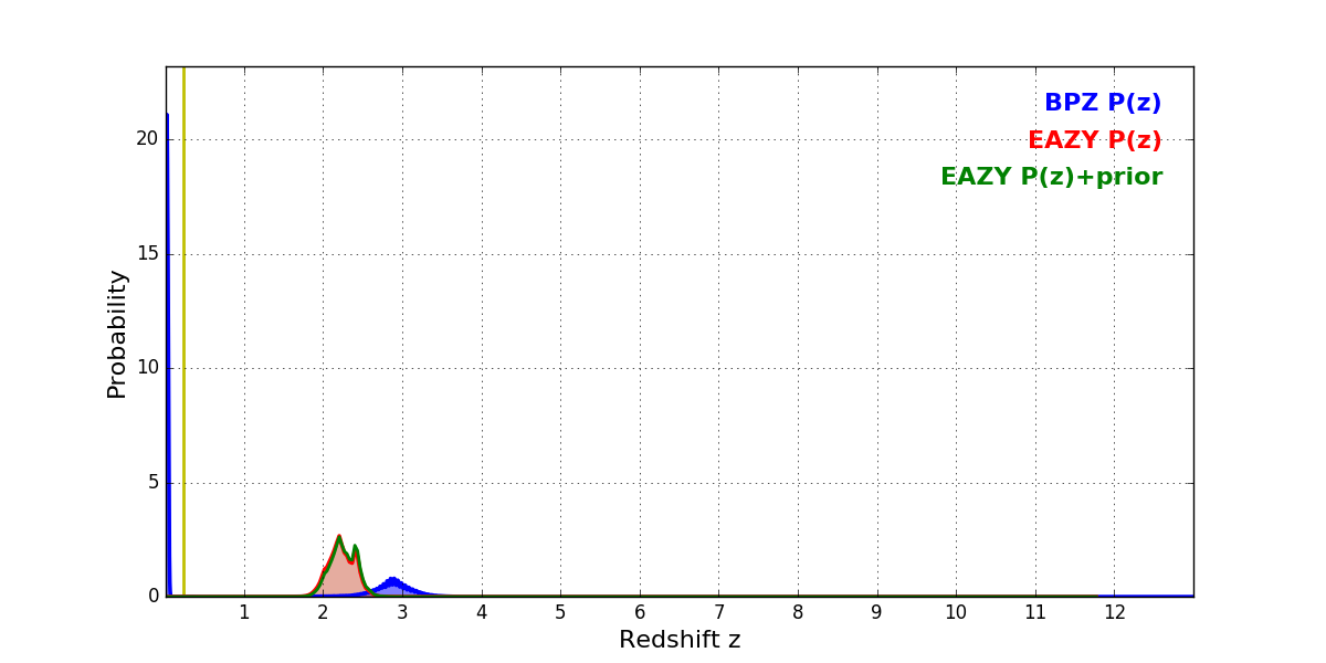 In P(z) plots: Yellow lines mark the cluster redshift z = 0.228,