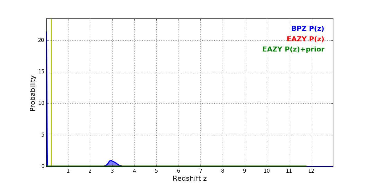 In P(z) plots: Yellow lines mark the cluster redshift z = 0.228,