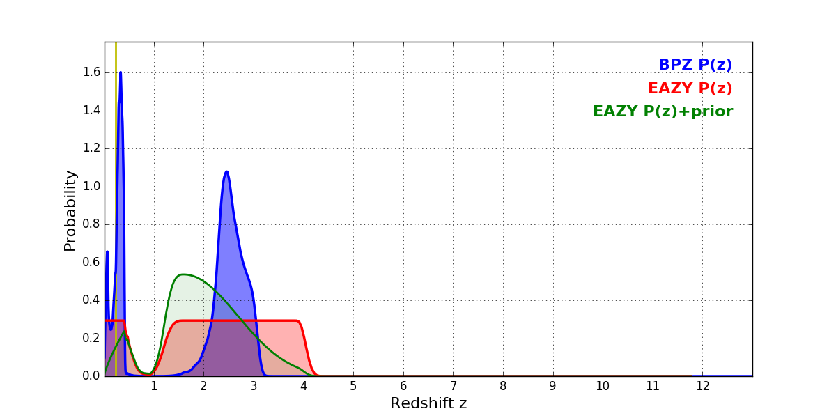 In P(z) plots: Yellow lines mark the cluster redshift z = 0.228,