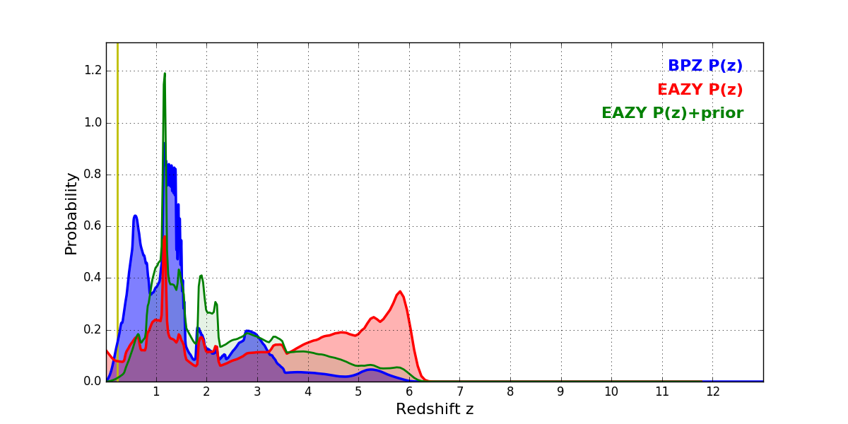 In P(z) plots: Yellow lines mark the cluster redshift z = 0.228,