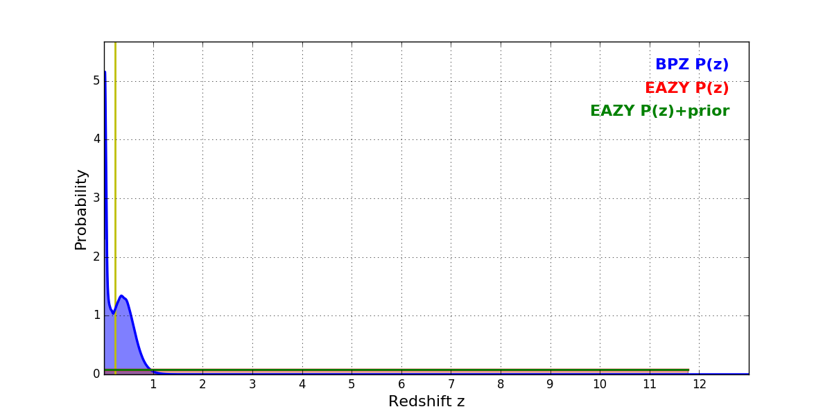 In P(z) plots: Yellow lines mark the cluster redshift z = 0.228,