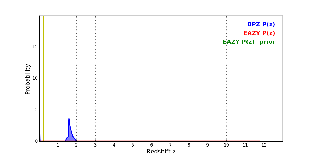 In P(z) plots: Yellow lines mark the cluster redshift z = 0.228,