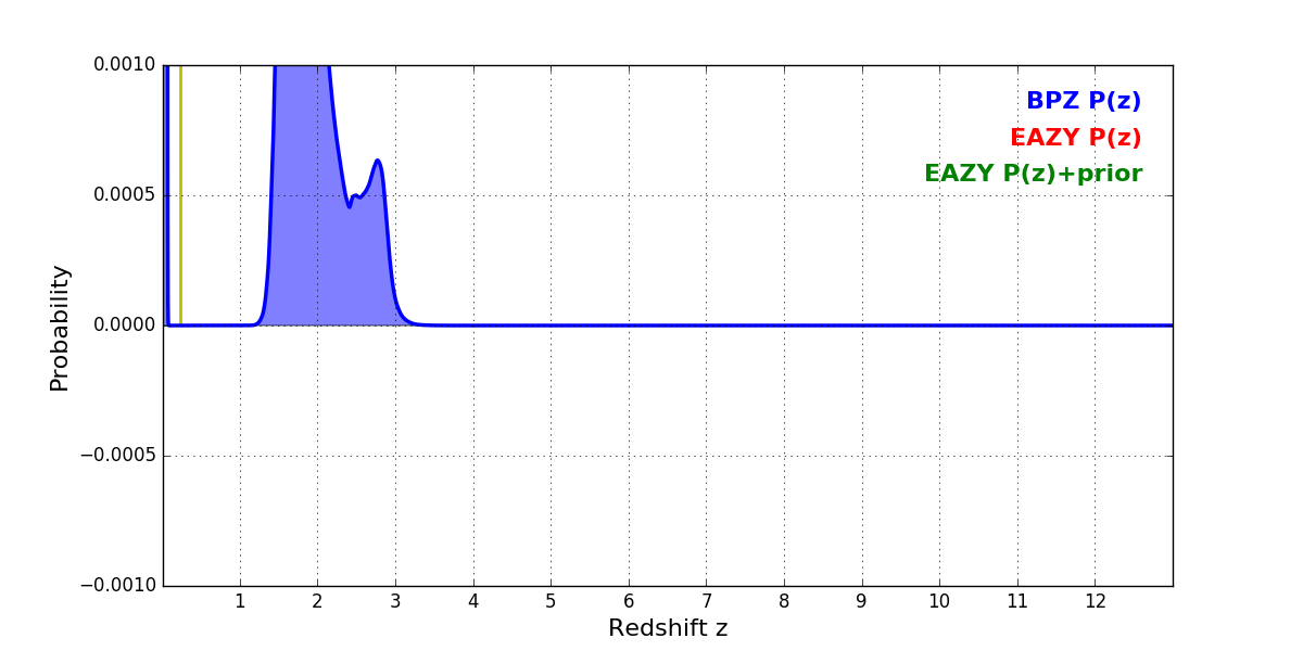 In P(z) plots: Yellow lines mark the cluster redshift z = 0.228,