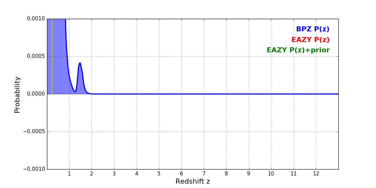 In P(z) plots: Yellow lines mark the cluster redshift z = 0.228,
